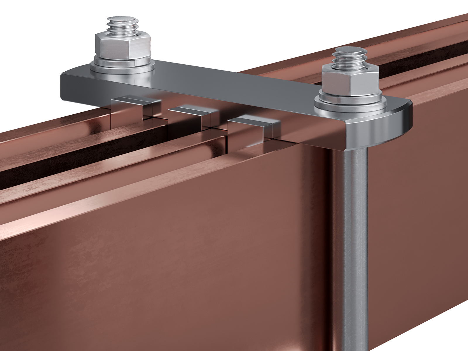 Schienenträger aus vernickeltem Messing zur Befestigung und Sicherung von Stromschienen aus Kupfer