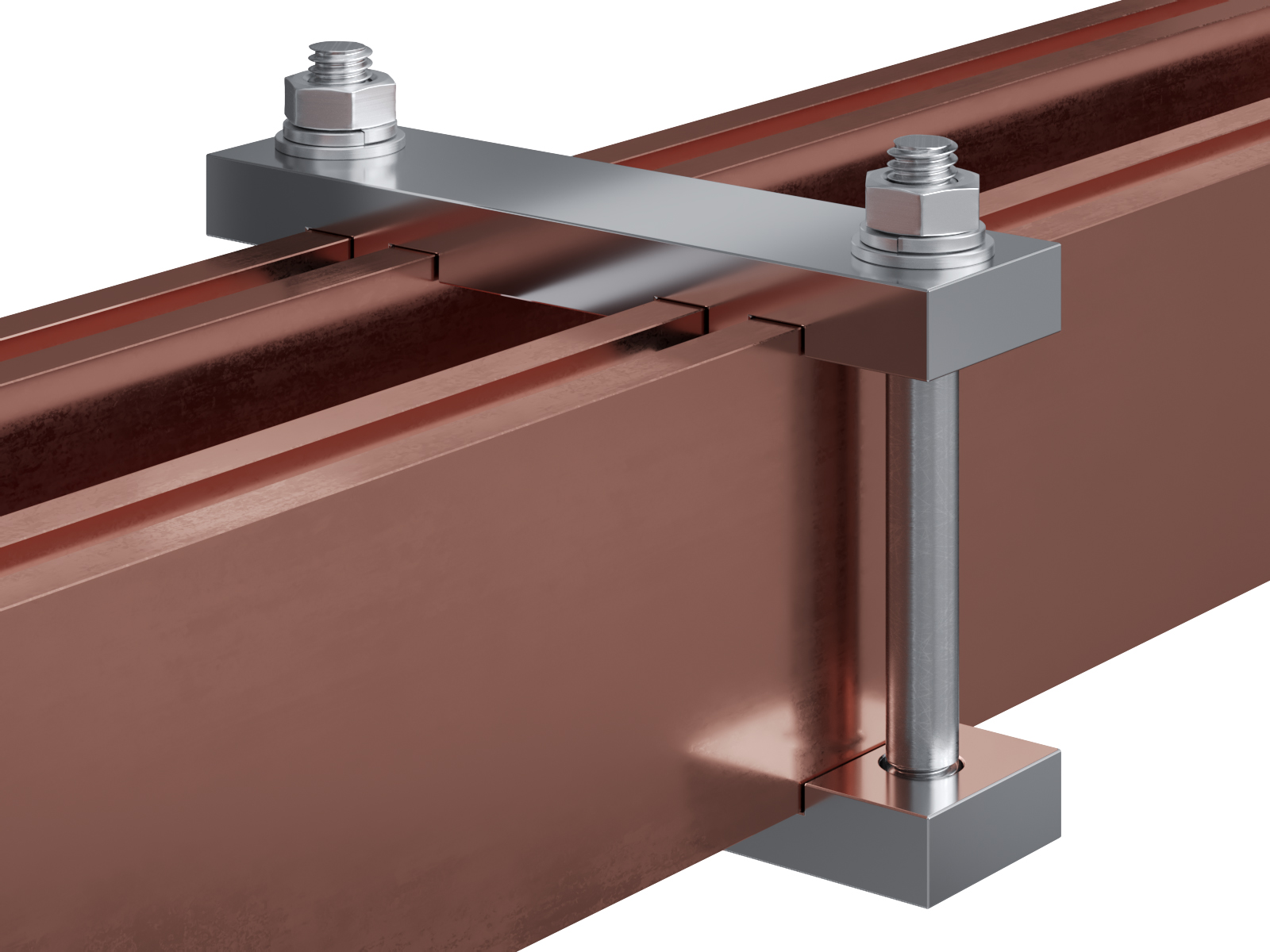 Schienenträger aus vernickeltem Messing zur Befestigung und Sicherung von Stromschienen aus Kupfer