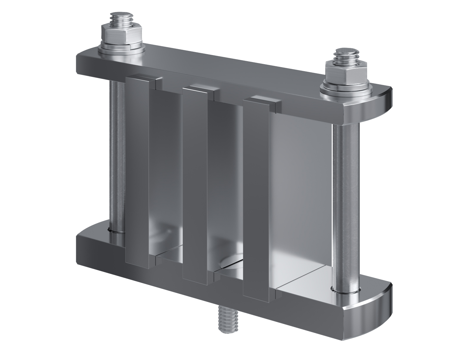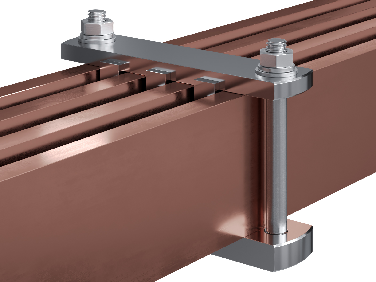 Schienenträger aus vernickeltem Messing zur Befestigung und Sicherung von Stromschienen aus Kupfer