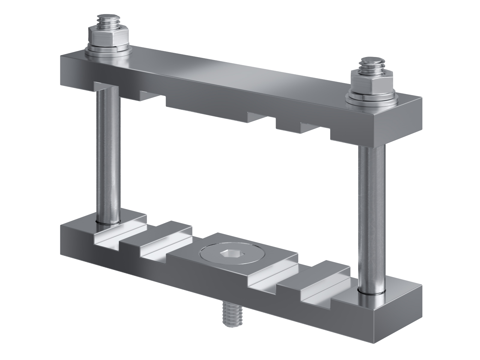 Schienenträger aus vernickeltem Messing zur Befestigung und Sicherung von Stromschienen aus Kupfer
