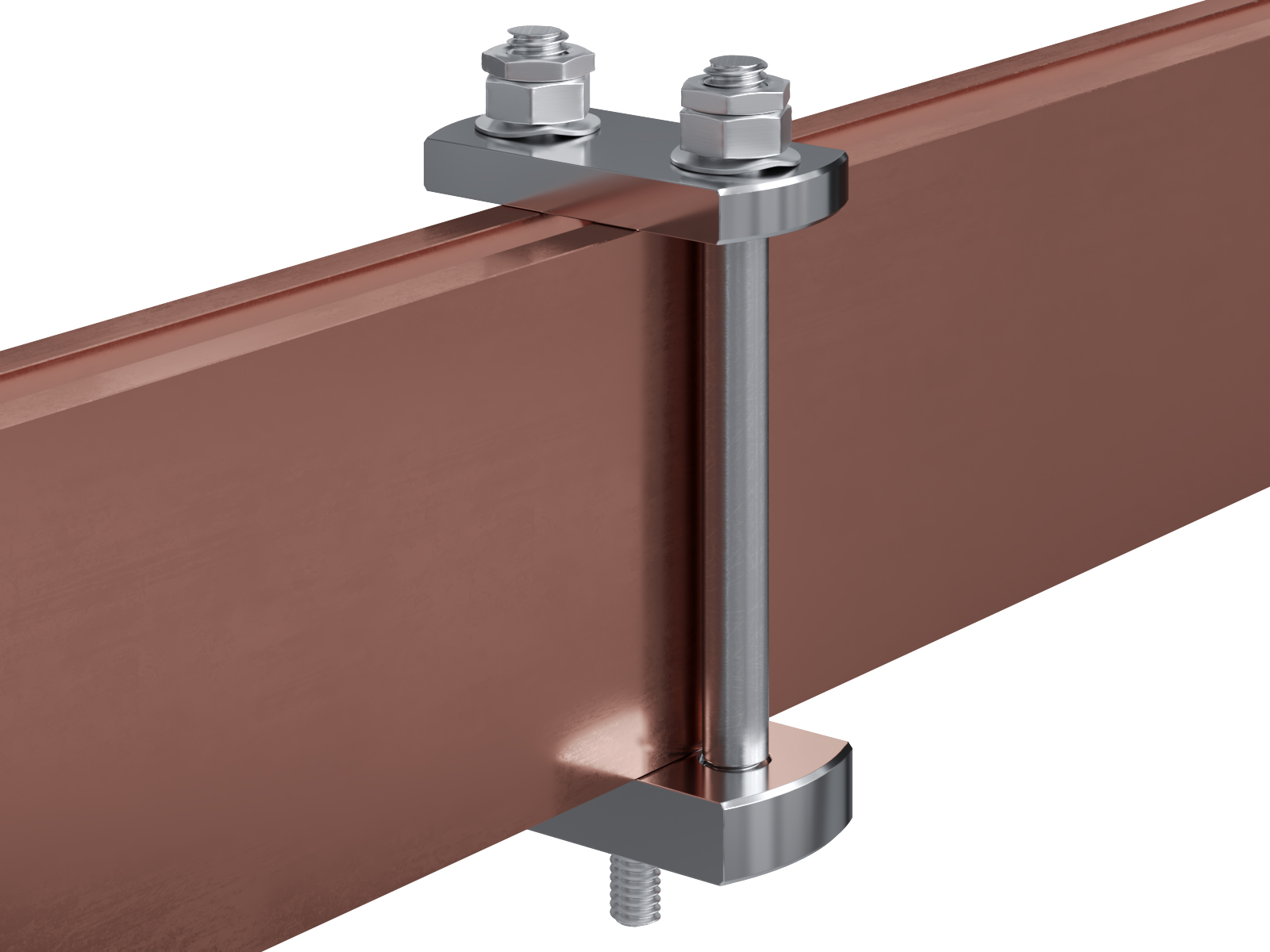 Schienenträger aus vernickeltem Messing zur Befestigung und Sicherung von Stromschienen aus Kupfer
