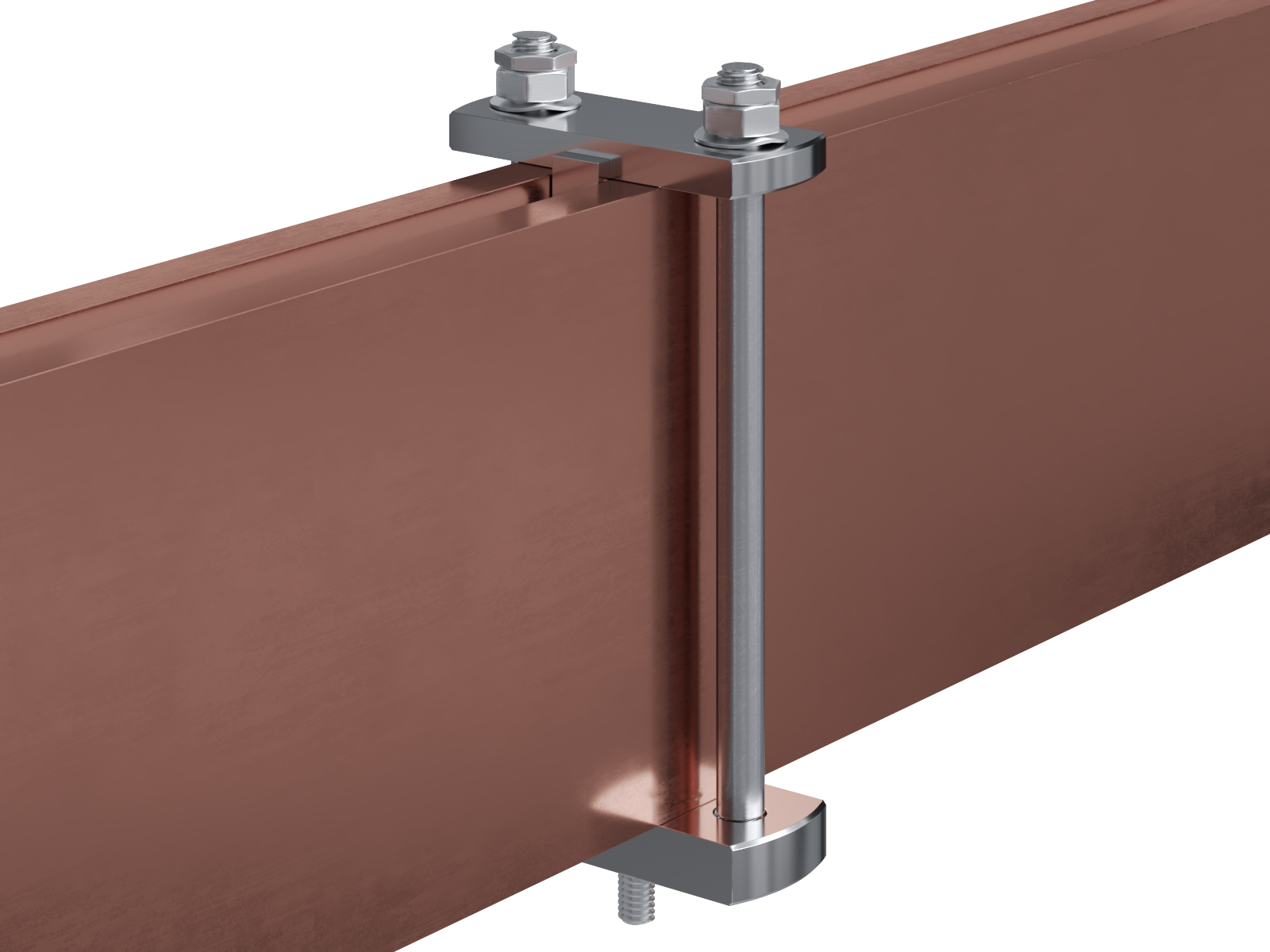 Schienenträger aus vernickeltem Messing zur Befestigung und Sicherung von Stromschienen aus Kupfer