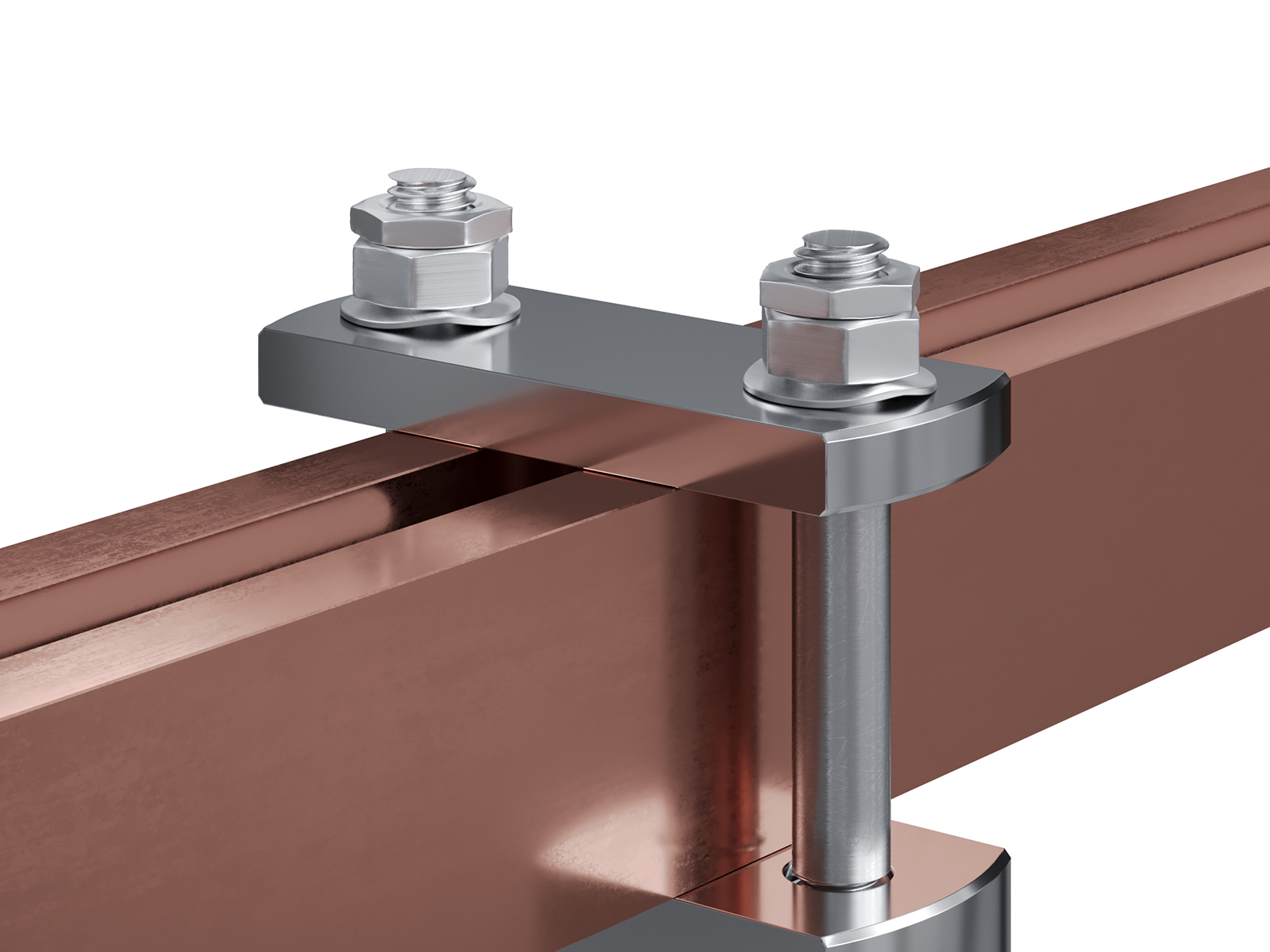 Schienenträger aus vernickeltem Messing zur Befestigung und Sicherung von Stromschienen aus Kupfer