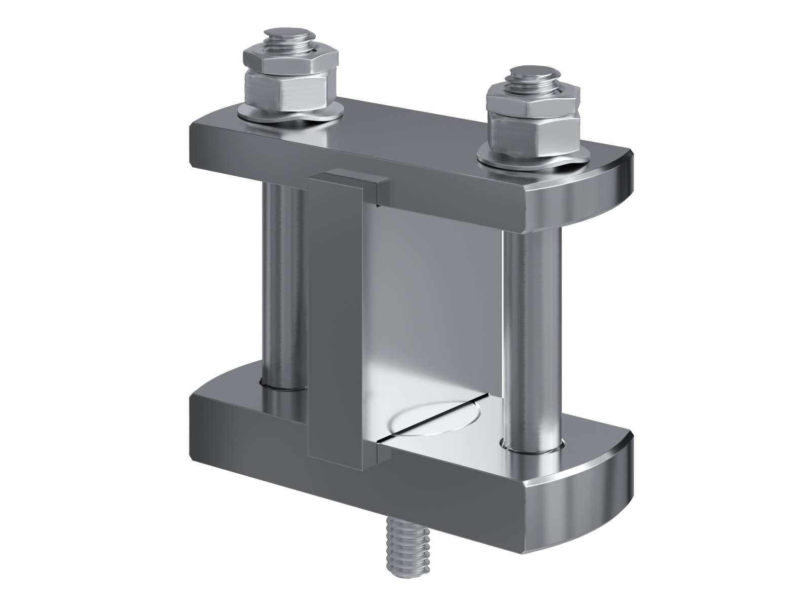 Schienenträger aus vernickeltem Messing zur Befestigung und Sicherung von Stromschienen aus Kupfer