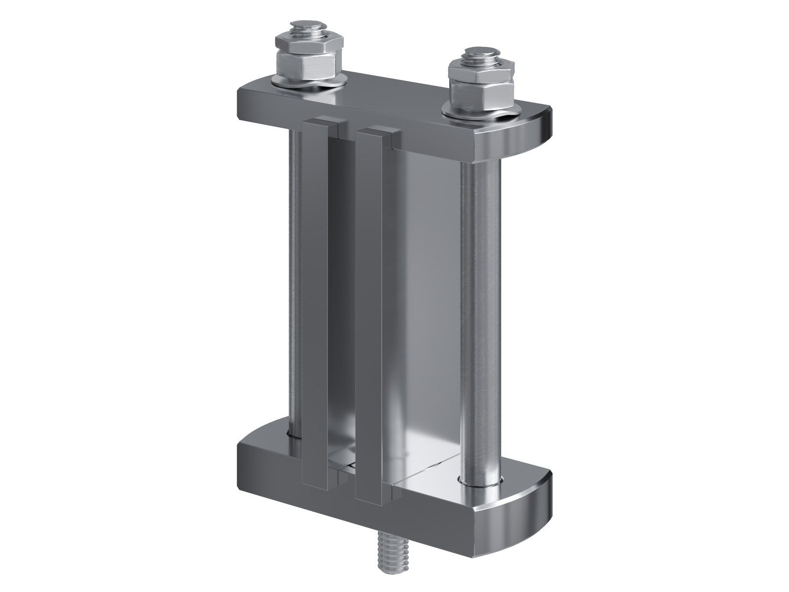 Schienenträger aus vernickeltem Messing zur Befestigung und Sicherung von Stromschienen aus Kupfer