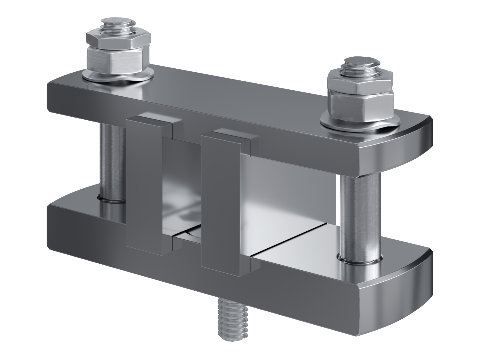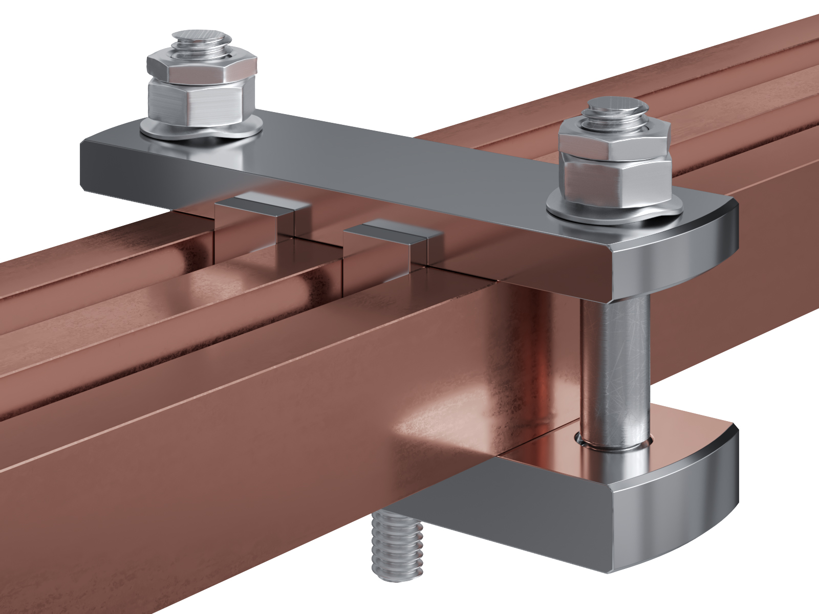 Schienenträger aus vernickeltem Messing zur Befestigung und Sicherung von Stromschienen aus Kupfer