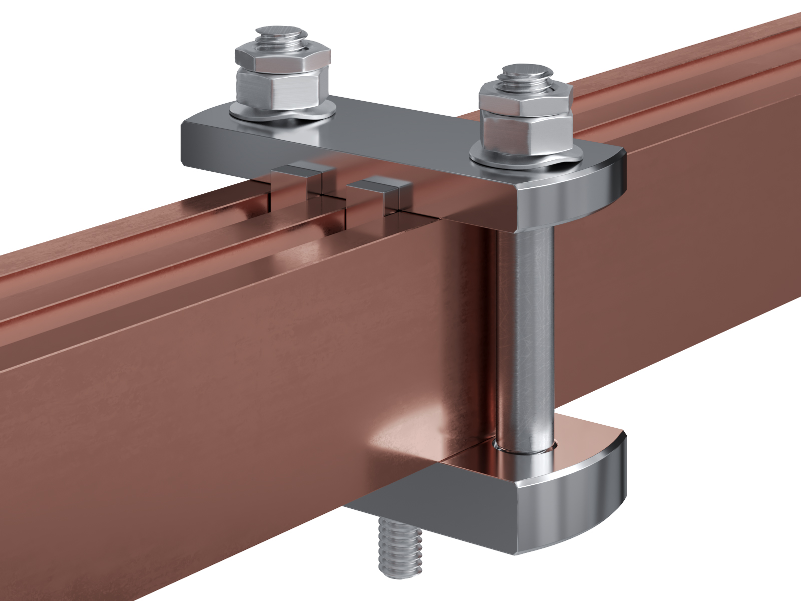 Schienenträger aus vernickeltem Messing zur Befestigung und Sicherung von Stromschienen aus Kupfer