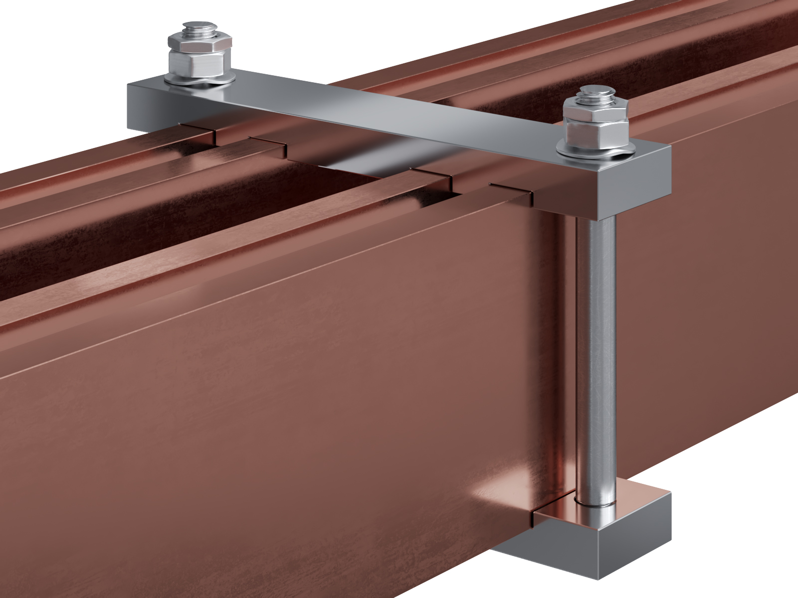 Schienenträger aus vernickeltem Messing zur Befestigung und Sicherung von Stromschienen aus Kupfer