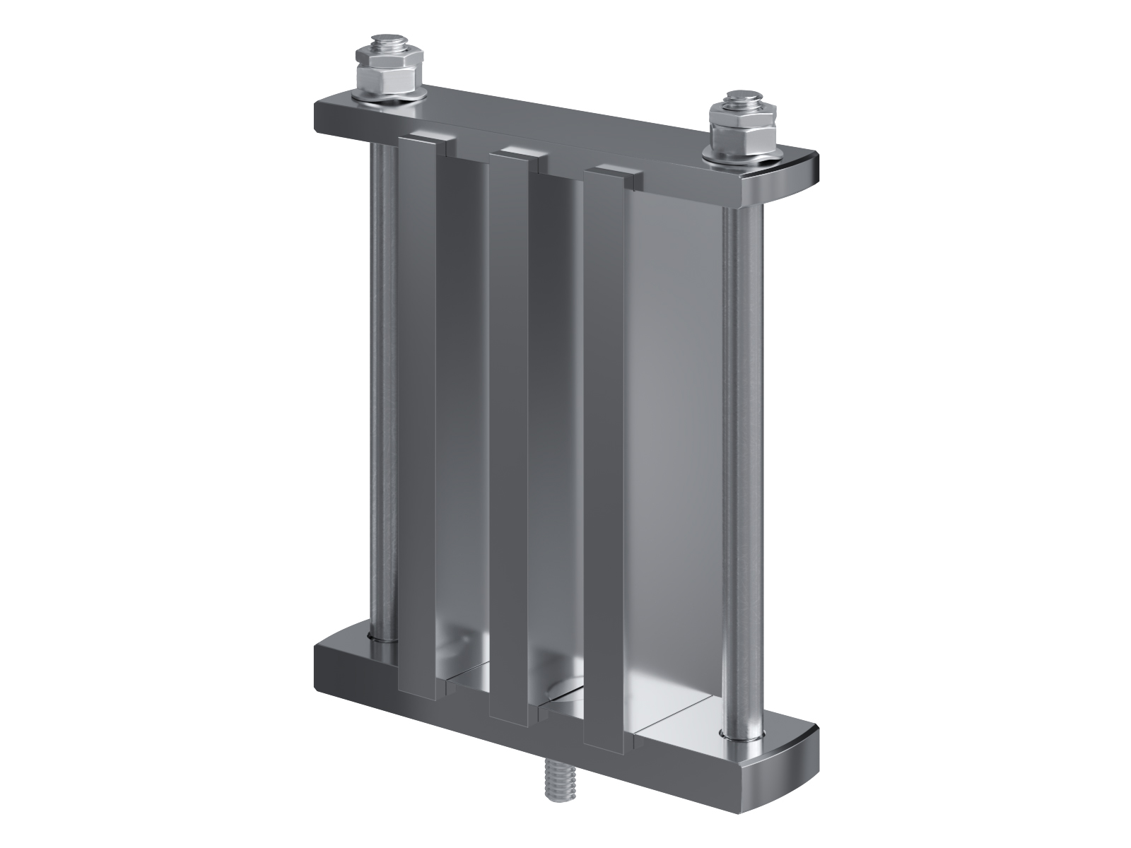 Schienenträger aus vernickeltem Messing zur Befestigung und Sicherung von Stromschienen aus Kupfer
