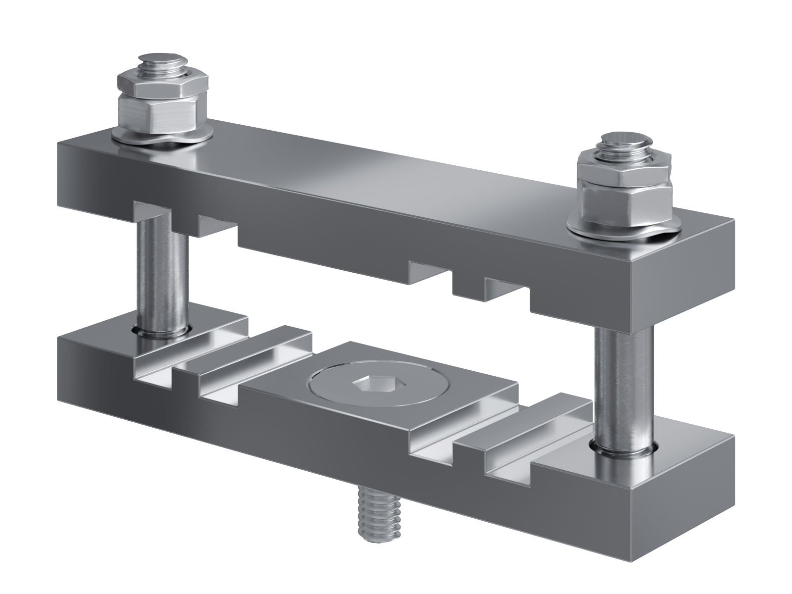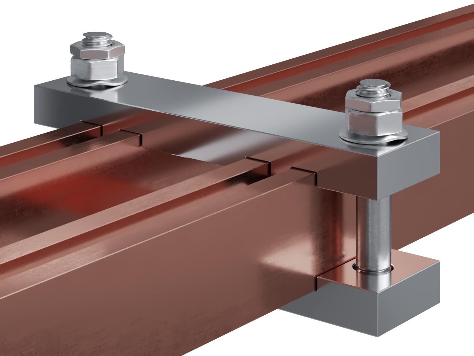 Schienenträger aus vernickeltem Messing zur Befestigung und Sicherung von Stromschienen aus Kupfer