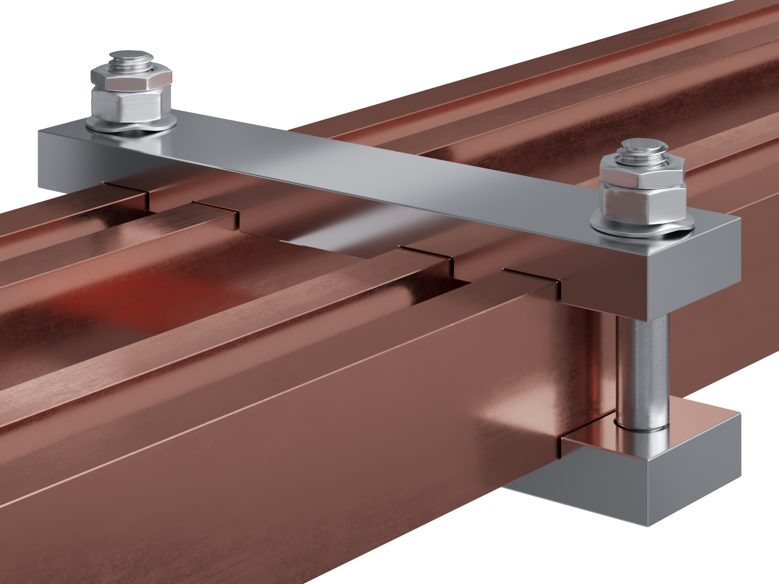 Schienenträger aus vernickeltem Messing zur Befestigung und Sicherung von Stromschienen aus Kupfer