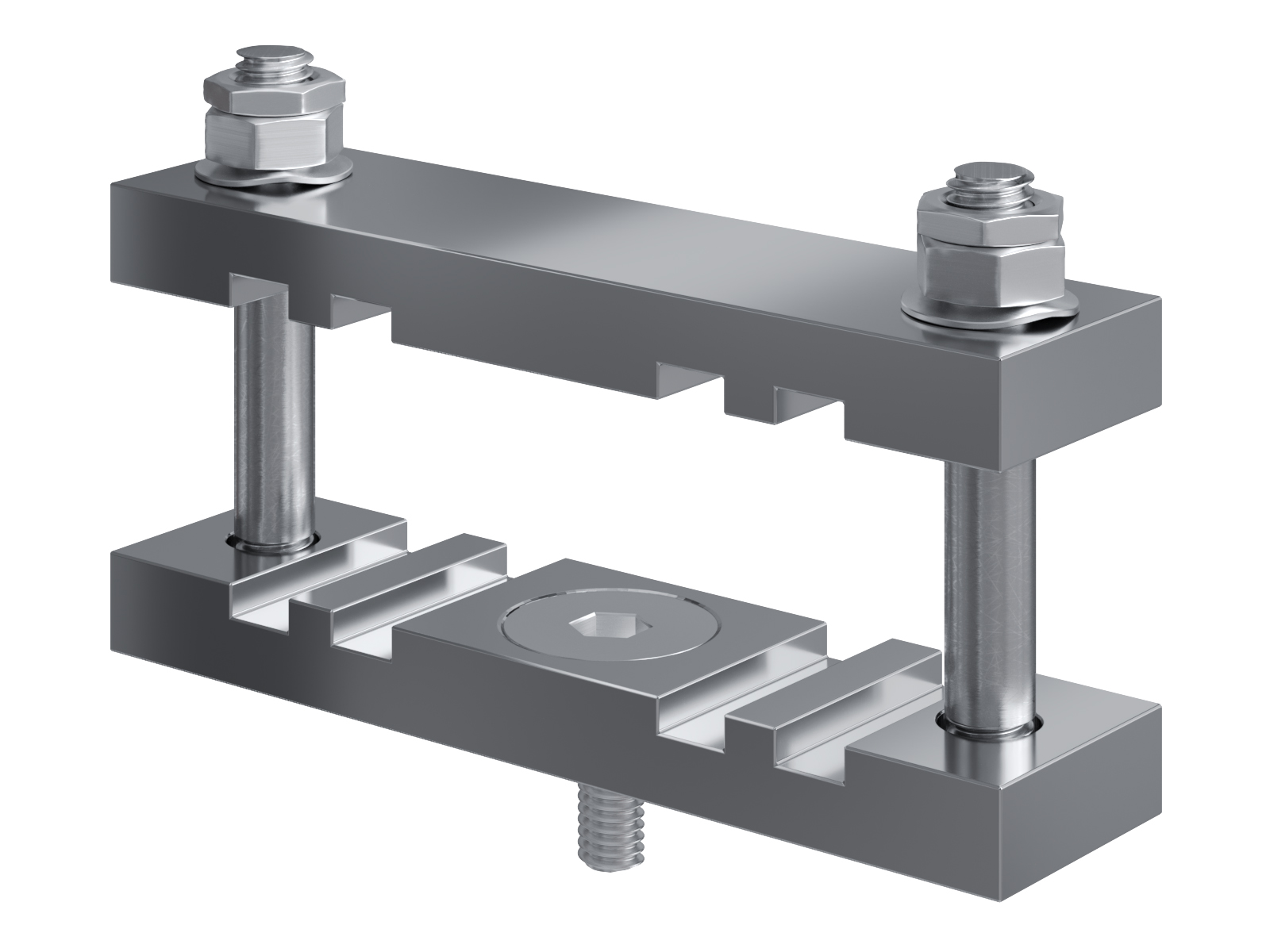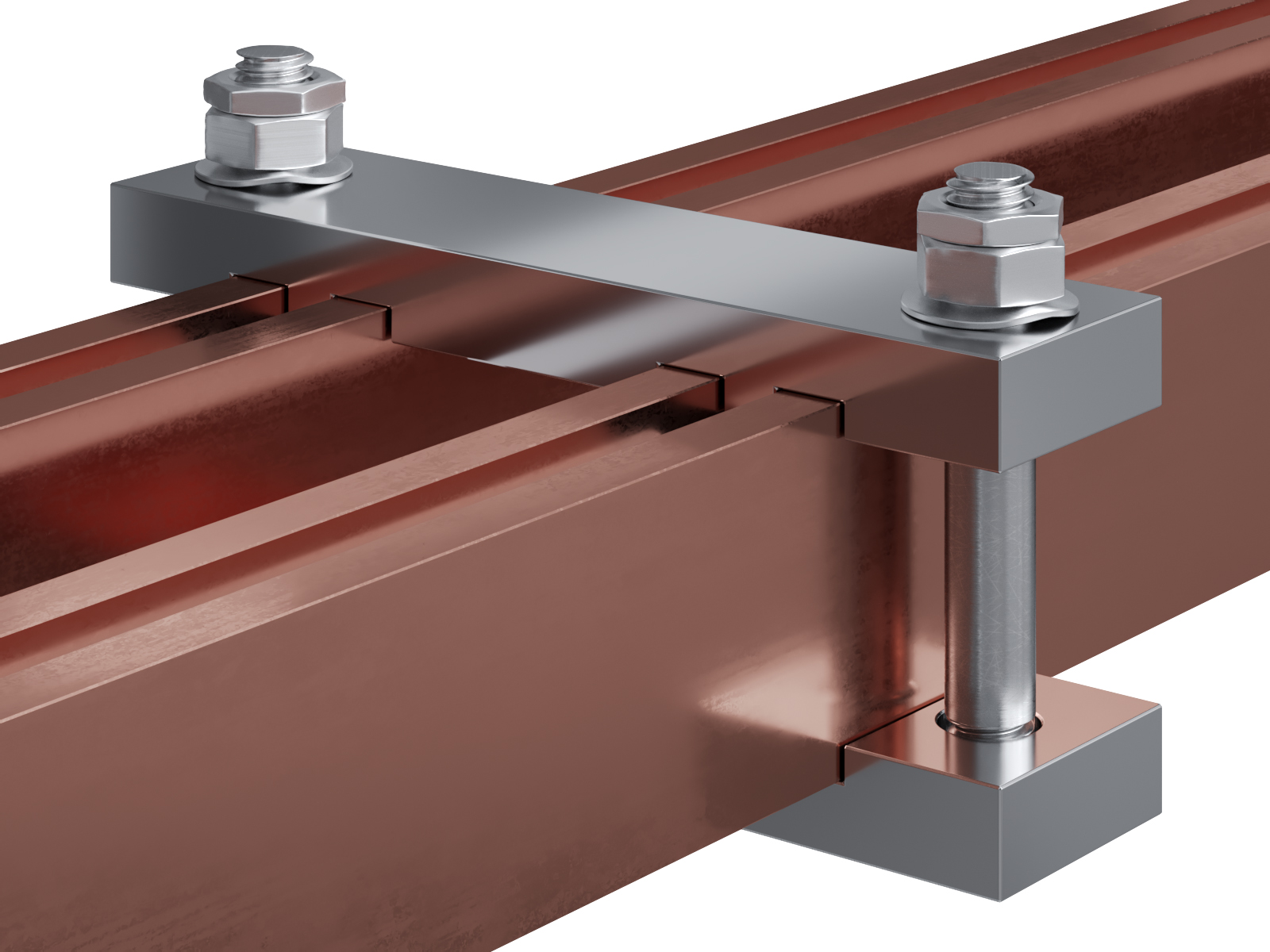 Schienenträger aus vernickeltem Messing zur Befestigung und Sicherung von Stromschienen aus Kupfer
