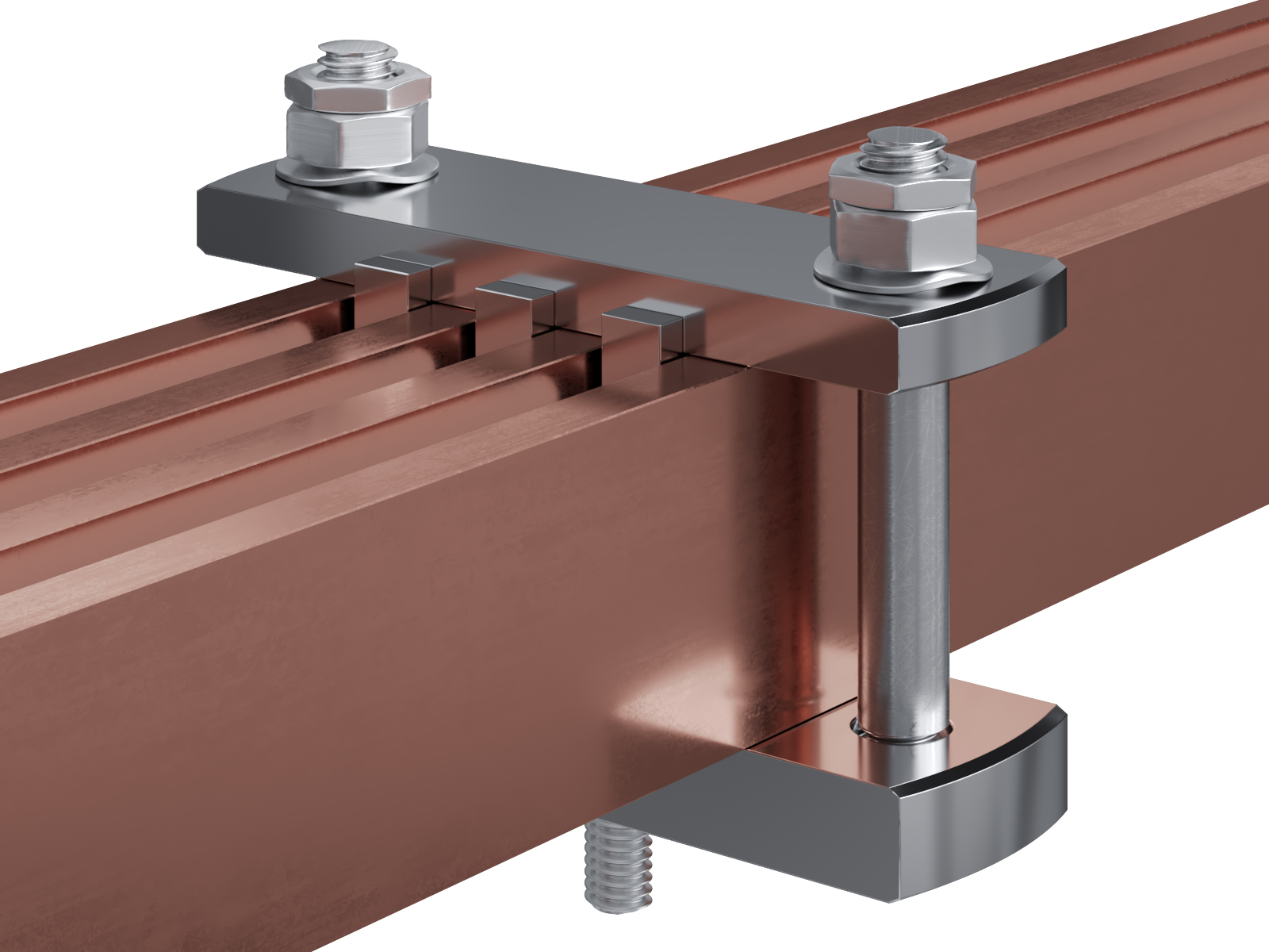 Schienenträger aus vernickeltem Messing zur Befestigung und Sicherung von Stromschienen aus Kupfer