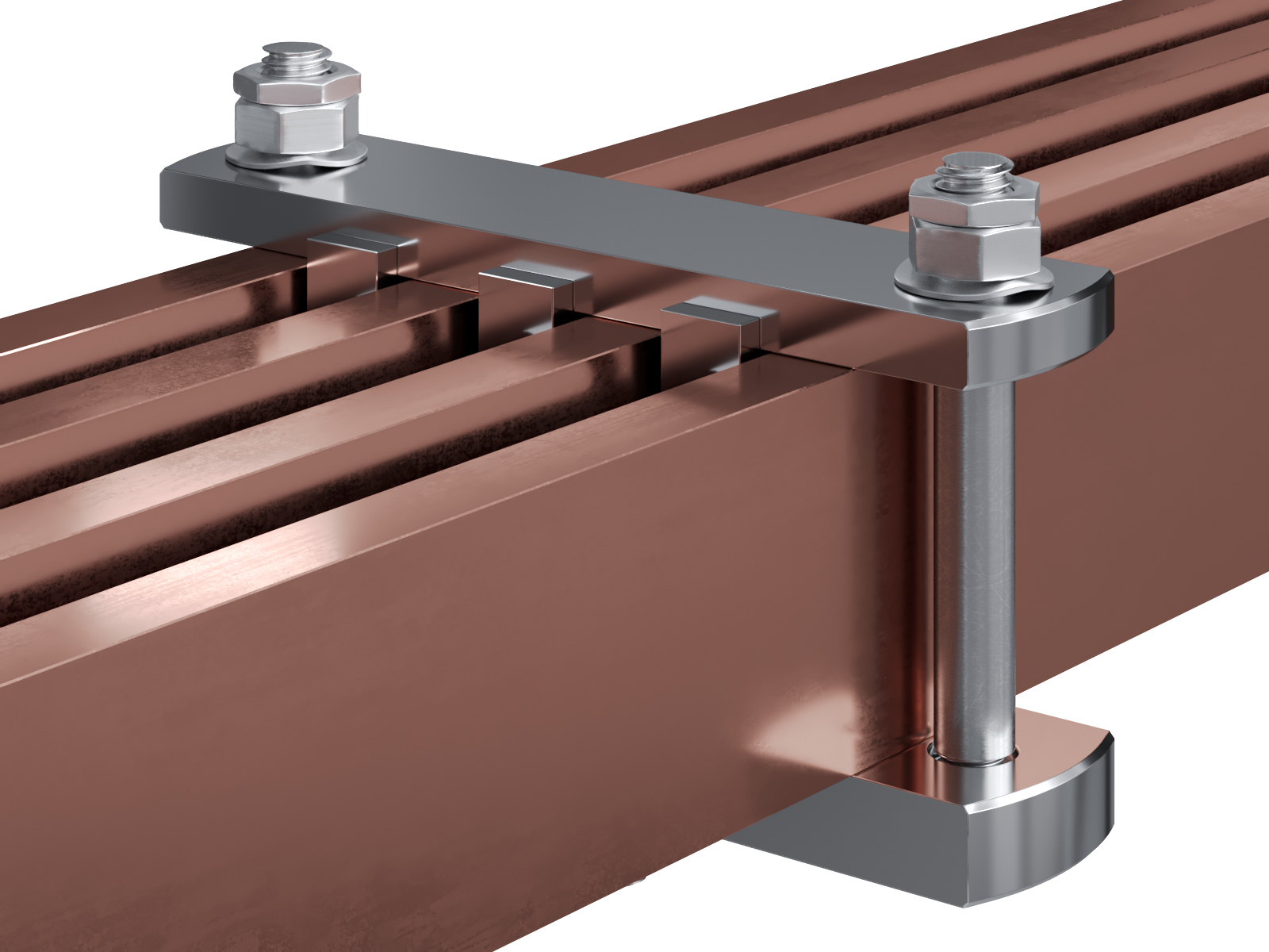 Schienenträger aus vernickeltem Messing zur Befestigung und Sicherung von Stromschienen aus Kupfer